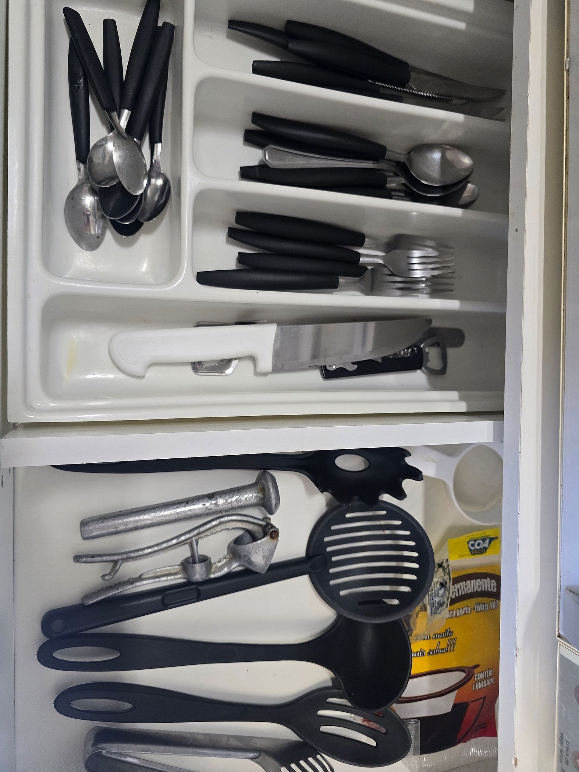 -Louças, panelas, copos, talheres e utensílios de cozinha, garrafa de café e coador.