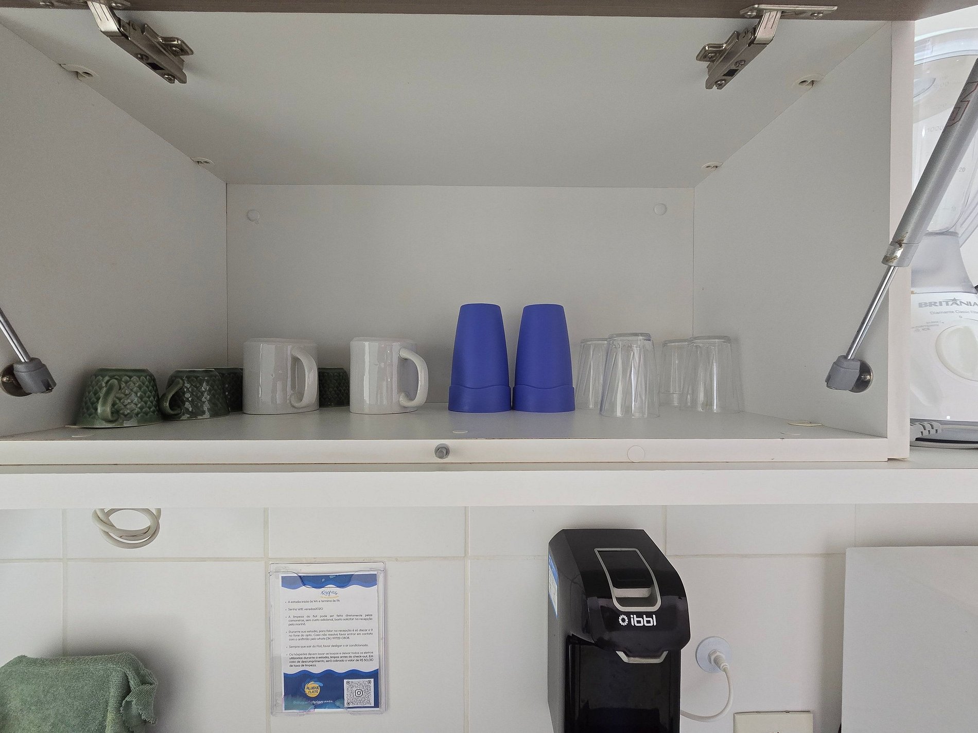-Louças, panelas, copos, talheres, utensílios básicos de cozinha, garrafa de café e coador.