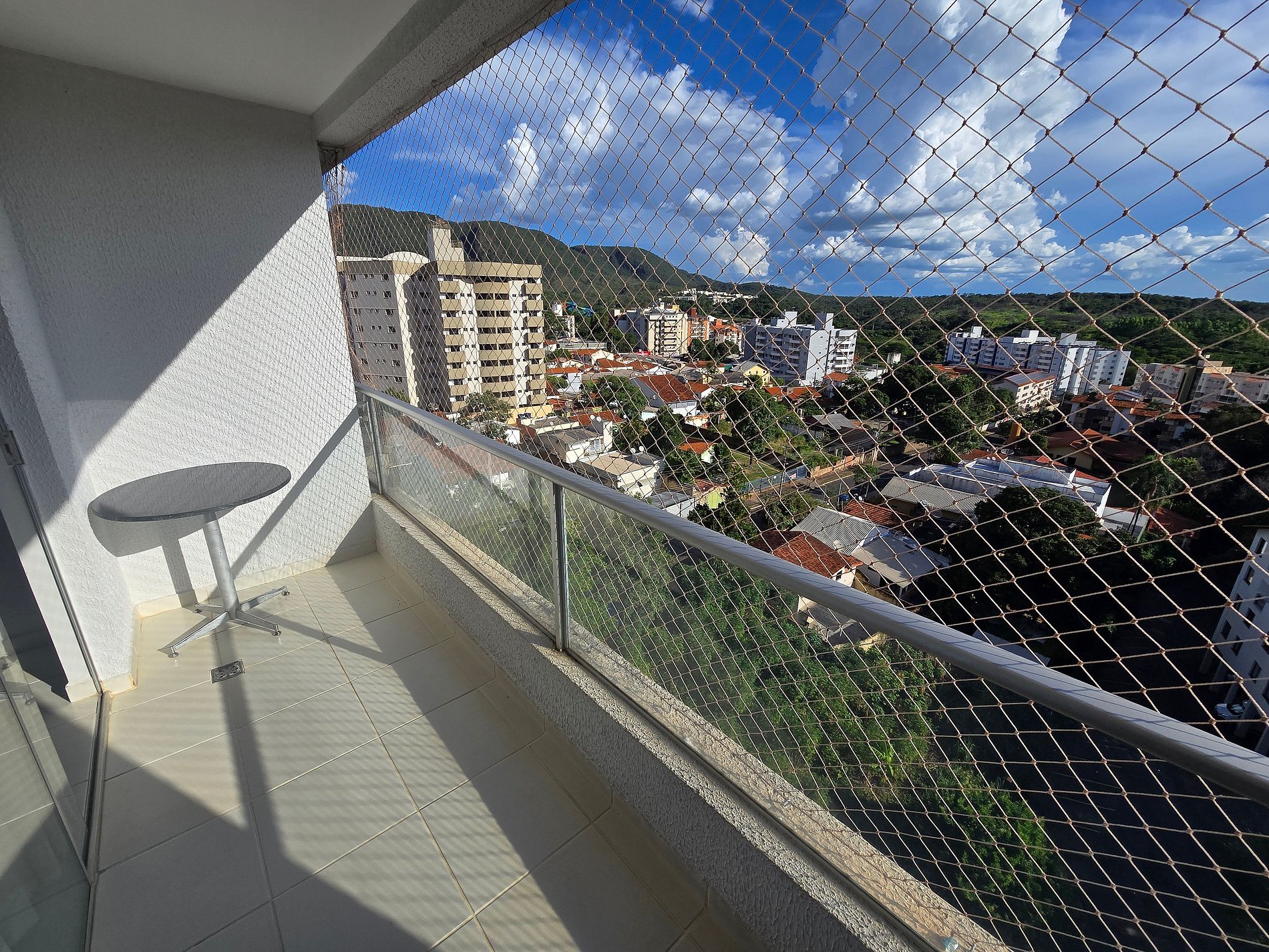 -Janela e sacada do apartamento com proteção de tela em perfeitas condições.