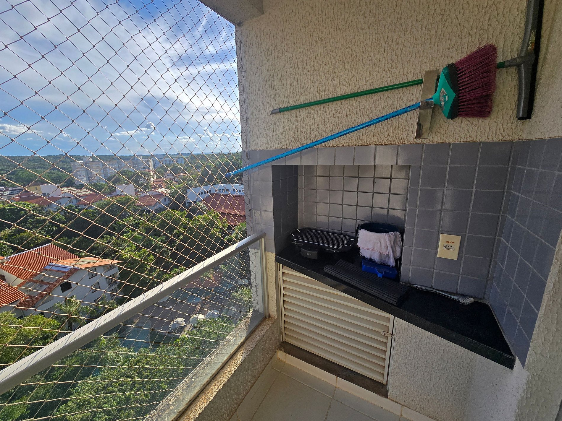 -Janela e sacada do apartamento com proteção de tela em perfeitas condições.