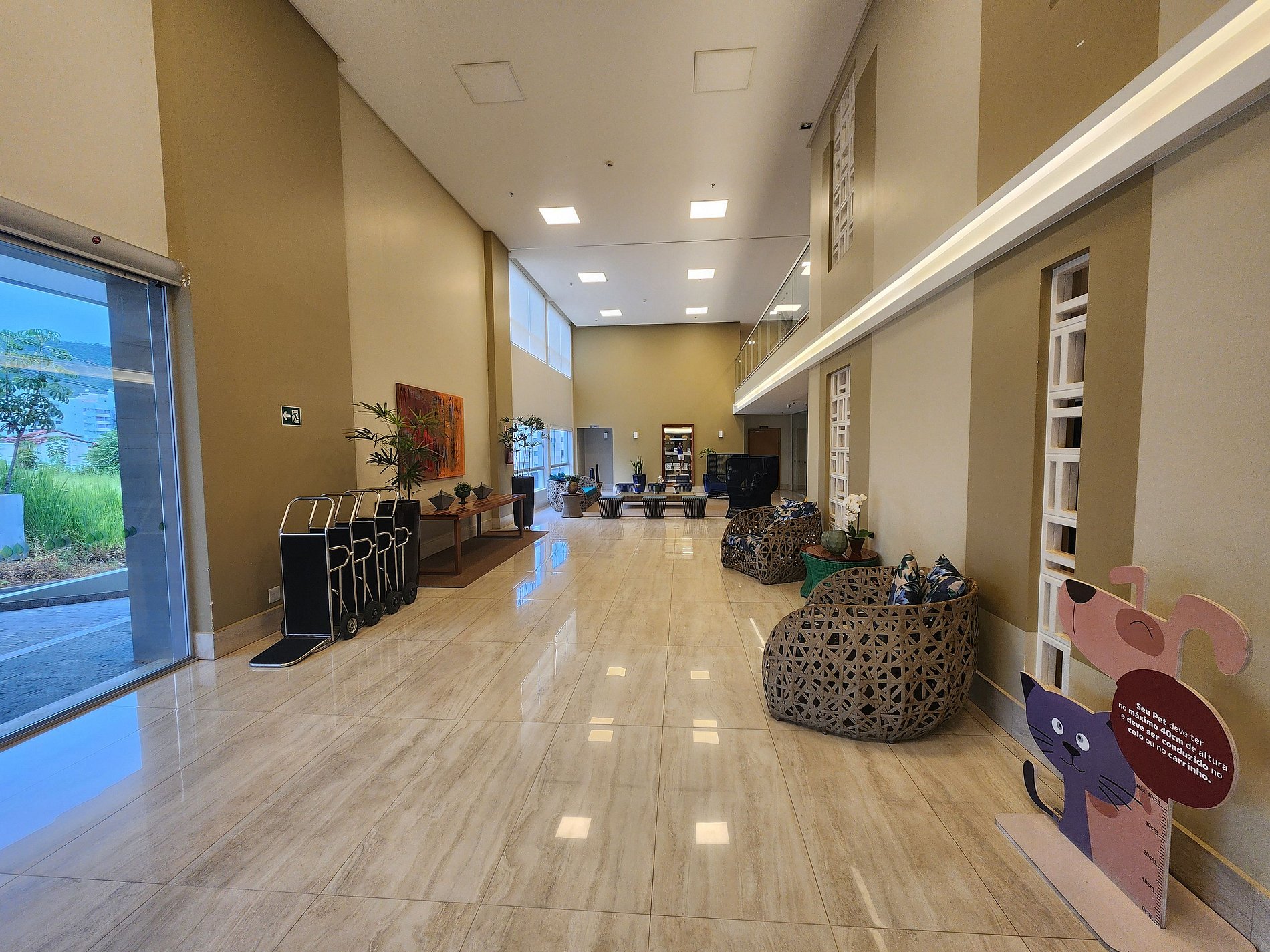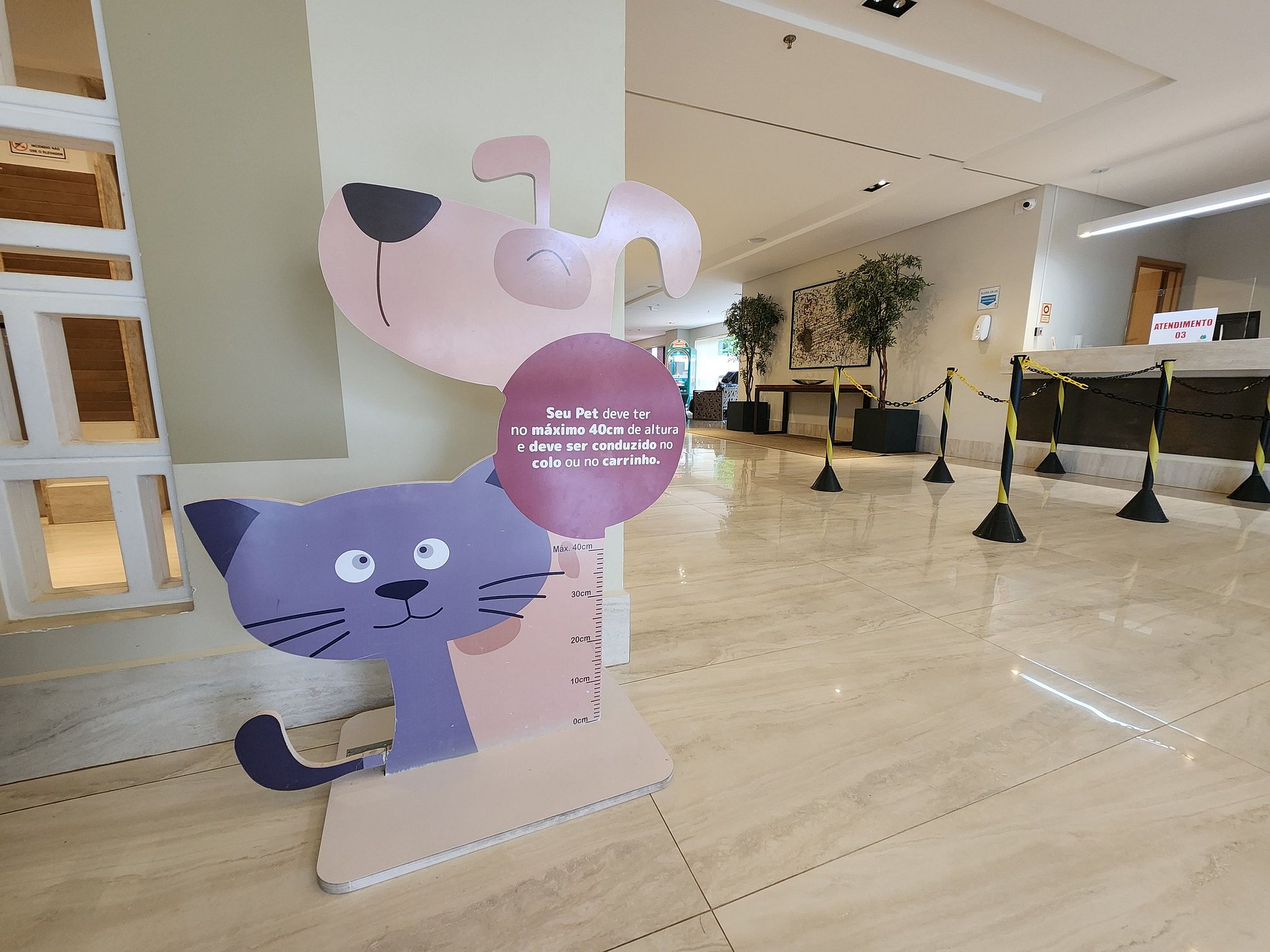 Animais Pets são aceitos desde que tenham no máximo 40cm de altura, e o condomínio coloca regras como por exemplo, só poder passar pela recepção com eles no colo e não pode levá-los na área das piscinas e outros espaços compartilhados.
