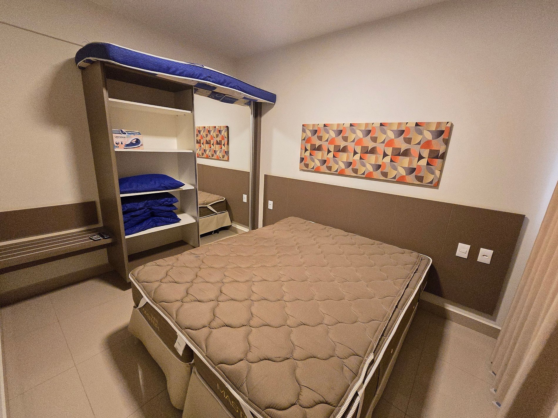 -Cama casal Queen e colchão de solteiro no quarto