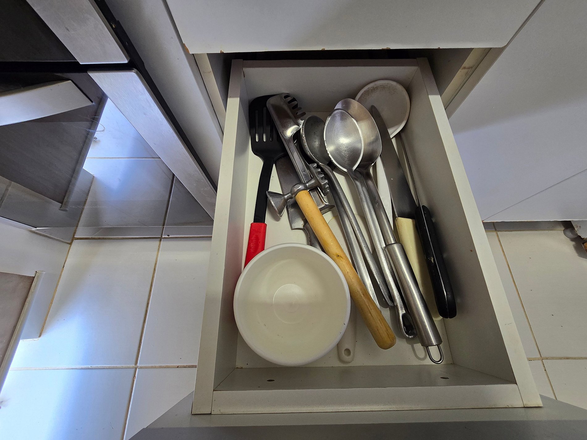 -Louças, panelas, copos, talheres, garrafa e coador de café e utensílios de cozinha.