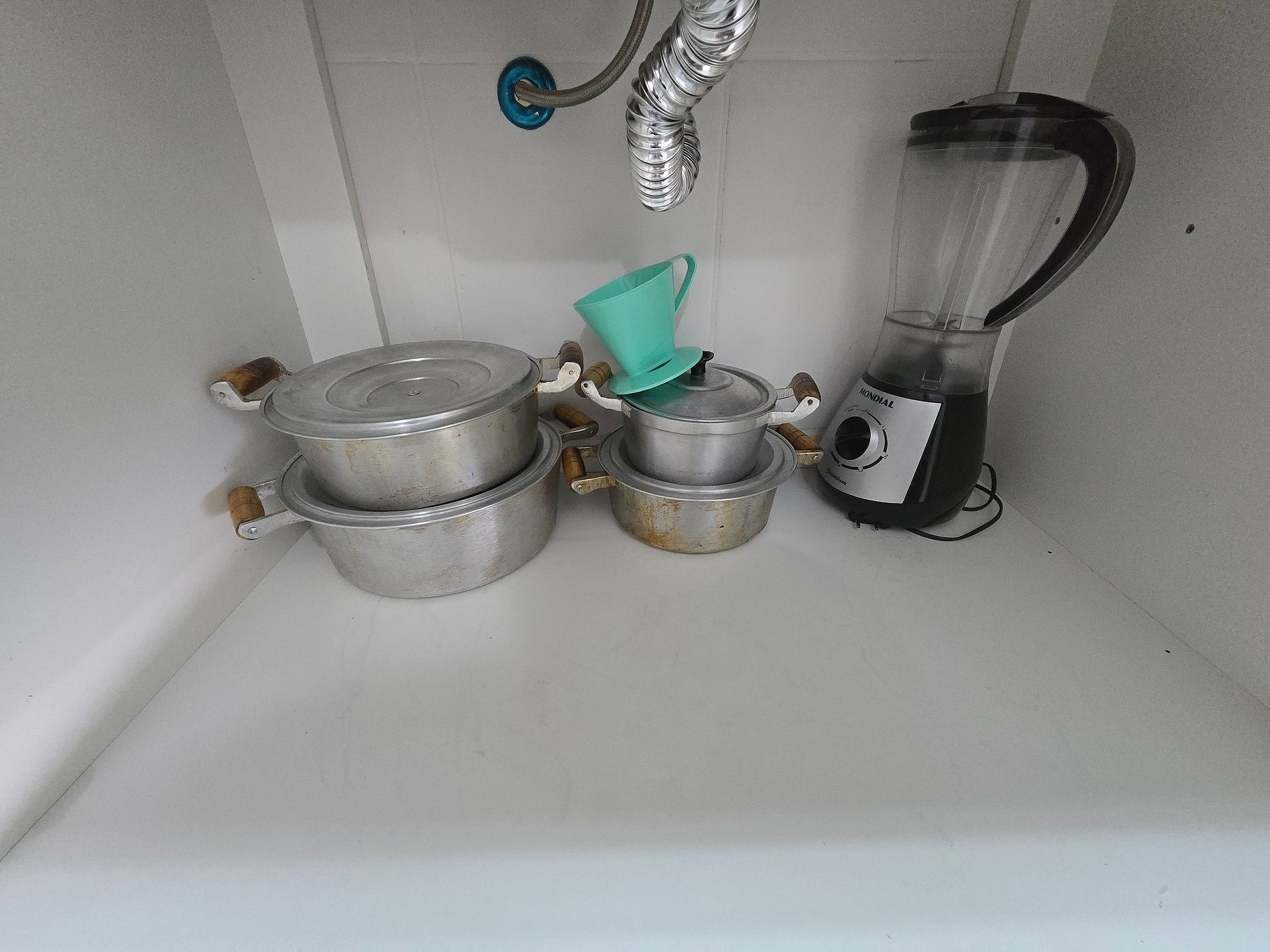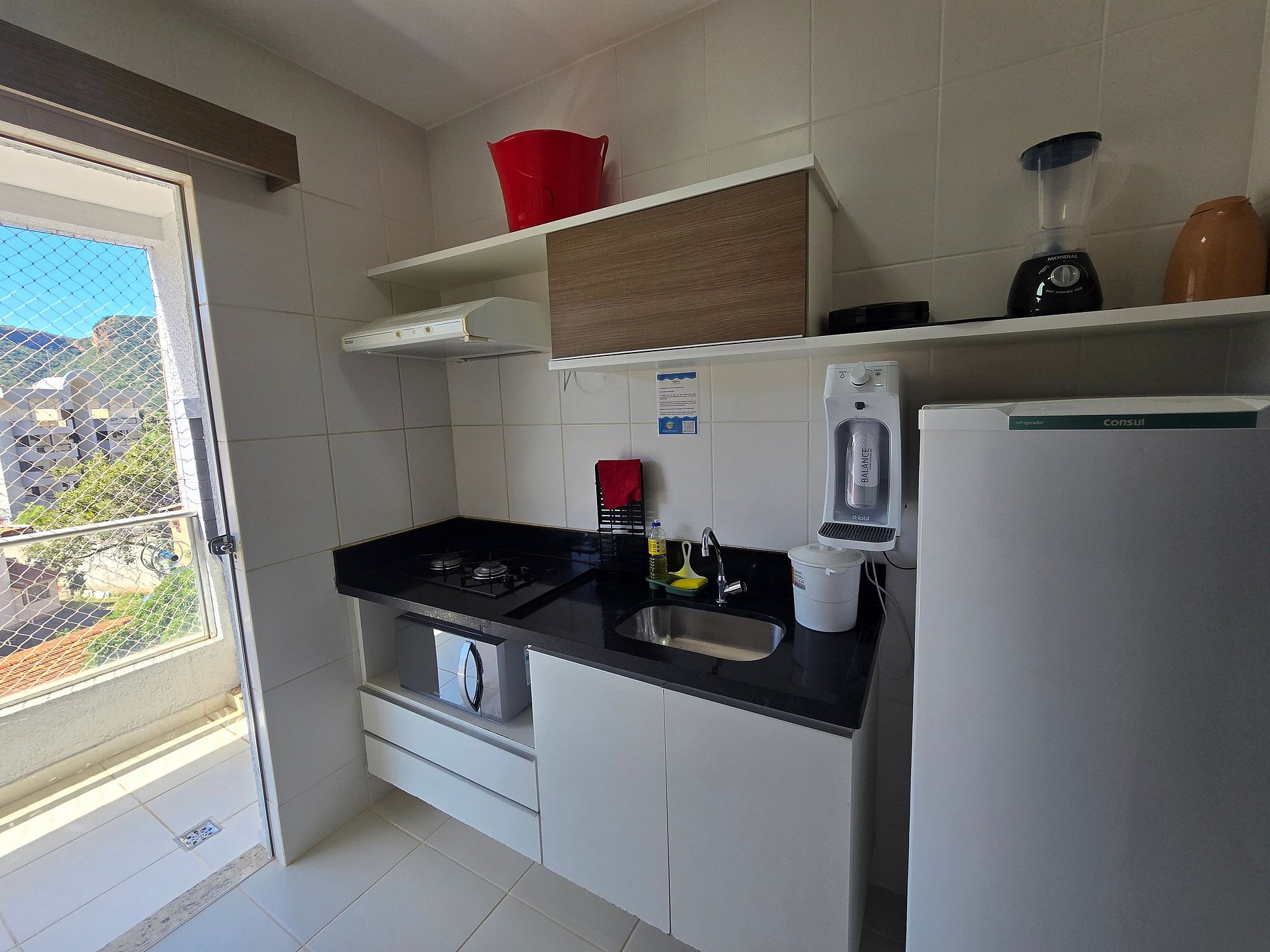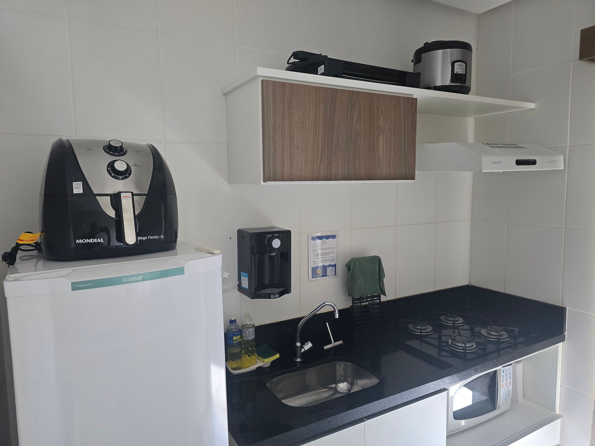 Airfryer 8L, churrasqueira elétrica, panela elétrica para arroz e legumes, cooktop, sanduicheira, liquidificador, filtro de água, geladeira, micro-ondas, louças, panelas, copos, talheres, saca-rolhas, utensílios de cozinha, garrafa e coador de café, balde para gelo, exaustor e pano de pia.
